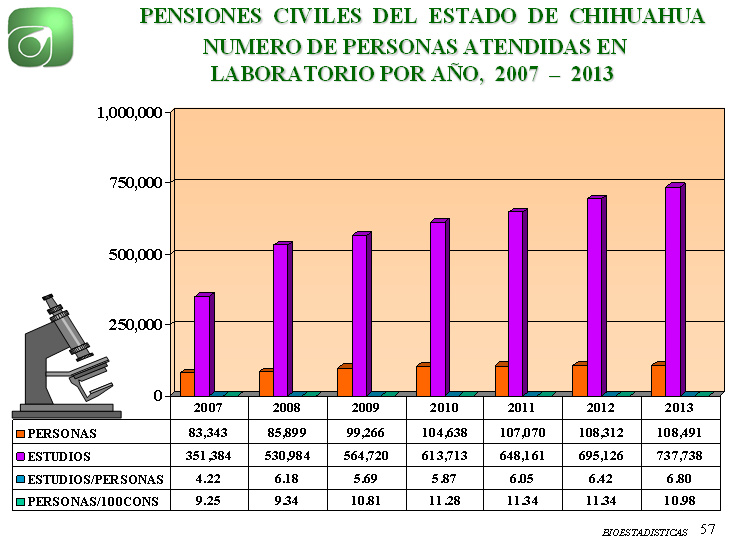 En el indicador de personas que hacen uso del servicio de laboratorio por cada 100 consultas otorgadas, Pensiones Civiles del Estado se había mantenido por debajo del indicador nacional que es de 10%, pero a partir del año 2009, lo sobrepasó, pues acudieron 10.81 pacientes por cada 100 consultas y en 2011 y 2012, este indicador fue de 11.34% y en la actualidad una ligera disminución con 10.98 pacientes por cada 100 consultas