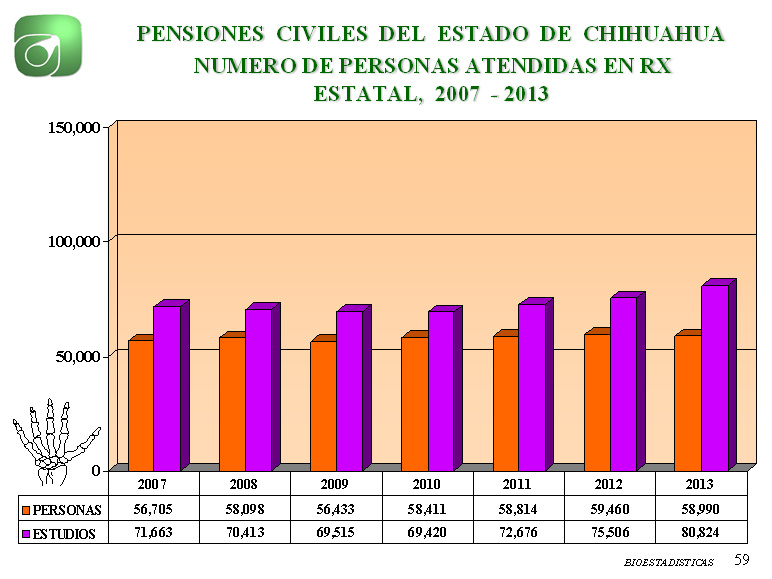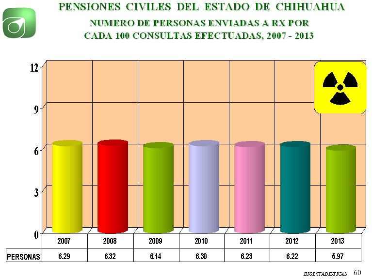 El Servicio de Rayos X de Pensiones Civiles del Estado, aplica indicadores establecidos por el sistema de Gestión de Calidad ISO 9001/2000 implementado con calidad certificada desde el año 2005. Sus resultados son muy evidentes en las gráficas siguientes en donde observamos que en el año 2007 se atendieron a 56,705 personas en el Servicio. De 2008 a 2013 observamos un discreto incremento, y al analizar el indicador de personas enviadas a Rayos X por cada 100 consultas, vemos que éste rebasa un poco también el indicador nacional que es de 5 por cada cien.