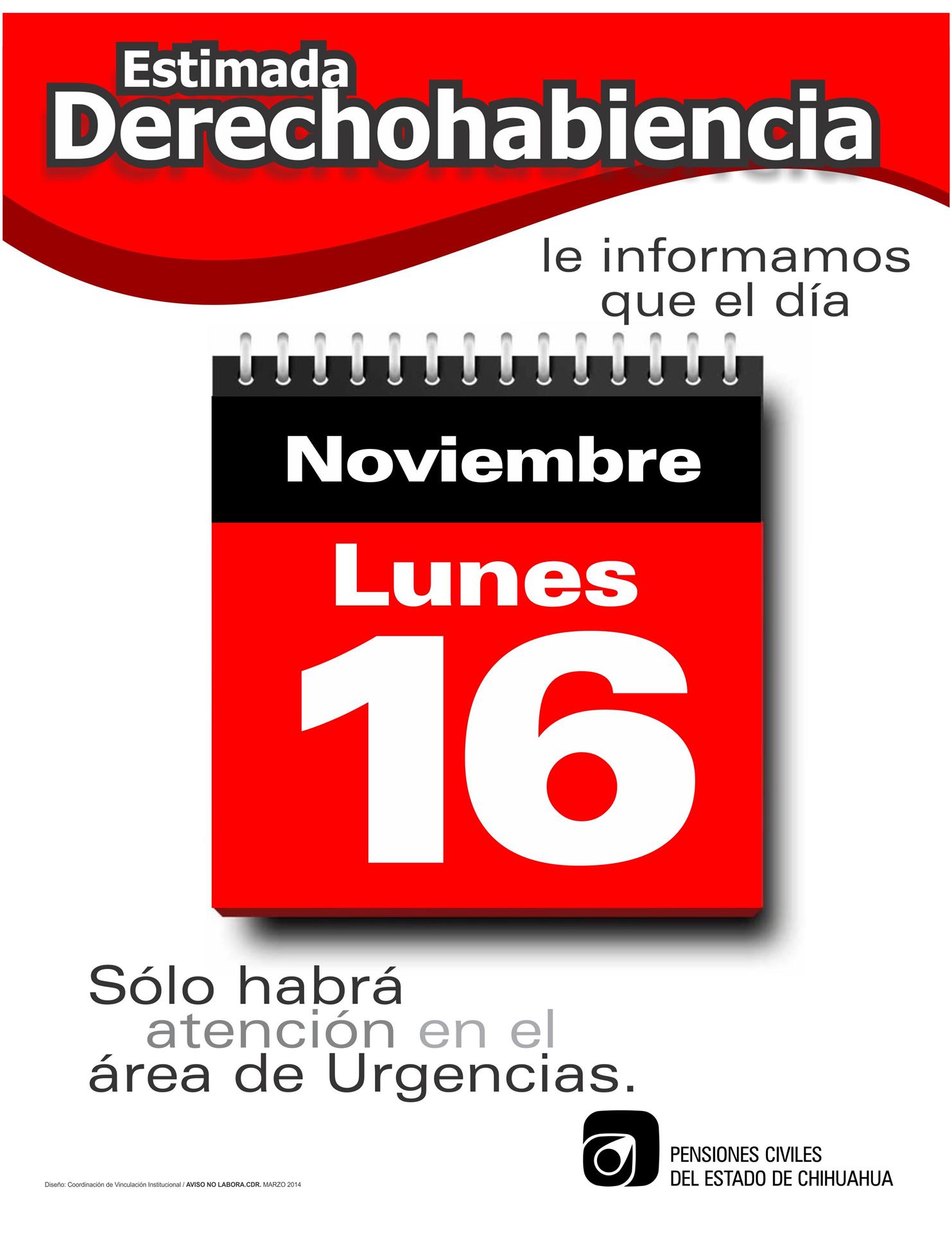 Estimado Derechohabiente le informamos que el día Lunes 16 de noviembre, sólo habrá atención en el área de Urgencias