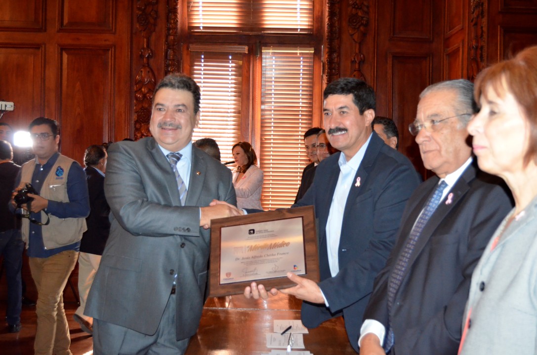 En una ceremonia solemne el Gobernador Constitucional del Estado Lic. Javier Corral Jurado, entregó esta mañana el “Premio Pensiones Civiles del Estado al Mérito Médico 2016” al Dr. Jesús Alfredo Chitika Franco, médico especialista en Ginecología y Obstetricia, en el “Salón Rojo” de Palacio de Gobierno, quien recibió el reconocimiento por parte del ejecutivo entre los aplausos de sus colegas, compañeros de trabajo, familiares, amigos y demás asistentes, así como los integrantes de la Junta Directiva y funcionarios de esta Institución. El gobernador Corral aprovecho la ocasión para extender el reconocimiento a todos los médicos por su día, y destacó que esta profesión es de respeto y admiración ya que se tiene que tener una gran vocación de servicio y una gran preparación y dedicación. Finalmente agradeció al jurado calificador por su buena decisión resaltando que es el primer reconocimiento que se otorga por parte de esta administración estatal. El Dr. Chitika Franco es egresado de la Universidad Autónoma de Chihuahua y con una gran trayectoria profesional por más de 36 años al servicio en las diferentes instituciones médicas en el estado. A lo largo de su carrera ha sido miembro del Colegio de Médicos de Chihuahua, miembro del Colegio de Ginecología y Obstetricia de Chihuahua, A.C., miembro de la Federación Mexicana de Ginecología y Obstetricia, así como miembro de la Federación Latinoamericana de Sociedades de Ginecología y Obstetricia. El Dr. Jesús Chitika en su discurso agradeció a su madre, hermanos e hijos, así como a sus colegas su respaldo a lo largo de su carrera profesional, y expresó sentirse muy orgulloso de formar parte de esta noble Institución que es Pensiones Civiles del Estado y al Sector Salud de Chihuahua. Por su parte, el Director General de Pensiones Civiles del Estado, C.P. Alberto José Herrera González resaltó la excelencia del desempeño del Dr. Jesús Alfredo Chitika Franco por su sencillez y el afecto con el que se conduce con los pacientes; así como la destacada labor y reconocimiento de los profesionales de la Salud de Pensiones Civiles del Estado de Chihuahua, cuyo servicio es reconocido a nivel nacional por los servicios médicos que les brinda a su derechohabiencia; y a todas aquellas personas hombres y mujeres que son parte de esta gran profesión.