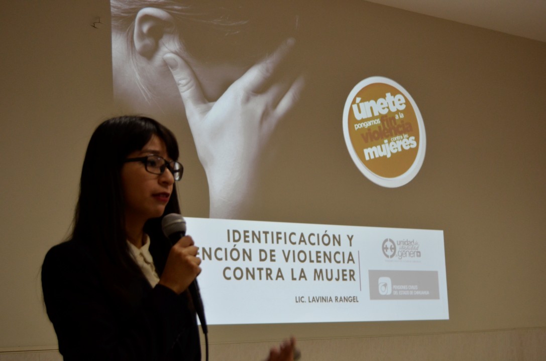 Con una audiencia de más de 200 personas la mañana y tarde de este 25 de noviembre la Unidad de Género de Pensiones Civiles en la delegación Chihuahua, presentó a través de la Lic. Lavinia Ekaterina Rangel una excelente plática con motivo del "Día Internacional de la Eliminación de Violencia Contra las Mujeres" a conmemorarse este día; la ponente mostró a los hombres y mujeres de las diversas áreas de esta Institución una interesante plática sobre la igualdad de género, los diferentes tipos de violencia y sus modalidades. Al inicio de la plática el contador Alberto Herrera director de Pensiones dirigió un mensaje de bienvenida, y exhortó a la audiencia a promover e involucrarse en la eliminación de todo tipo de violencia o situaciones que pudieran presentarse en nuestro lugar de trabajo sobre este tema, haciendo énfasis en la preponderancia que tiene la dirección general de Pensiones por no tolerar en ningún momento cualquier situación.