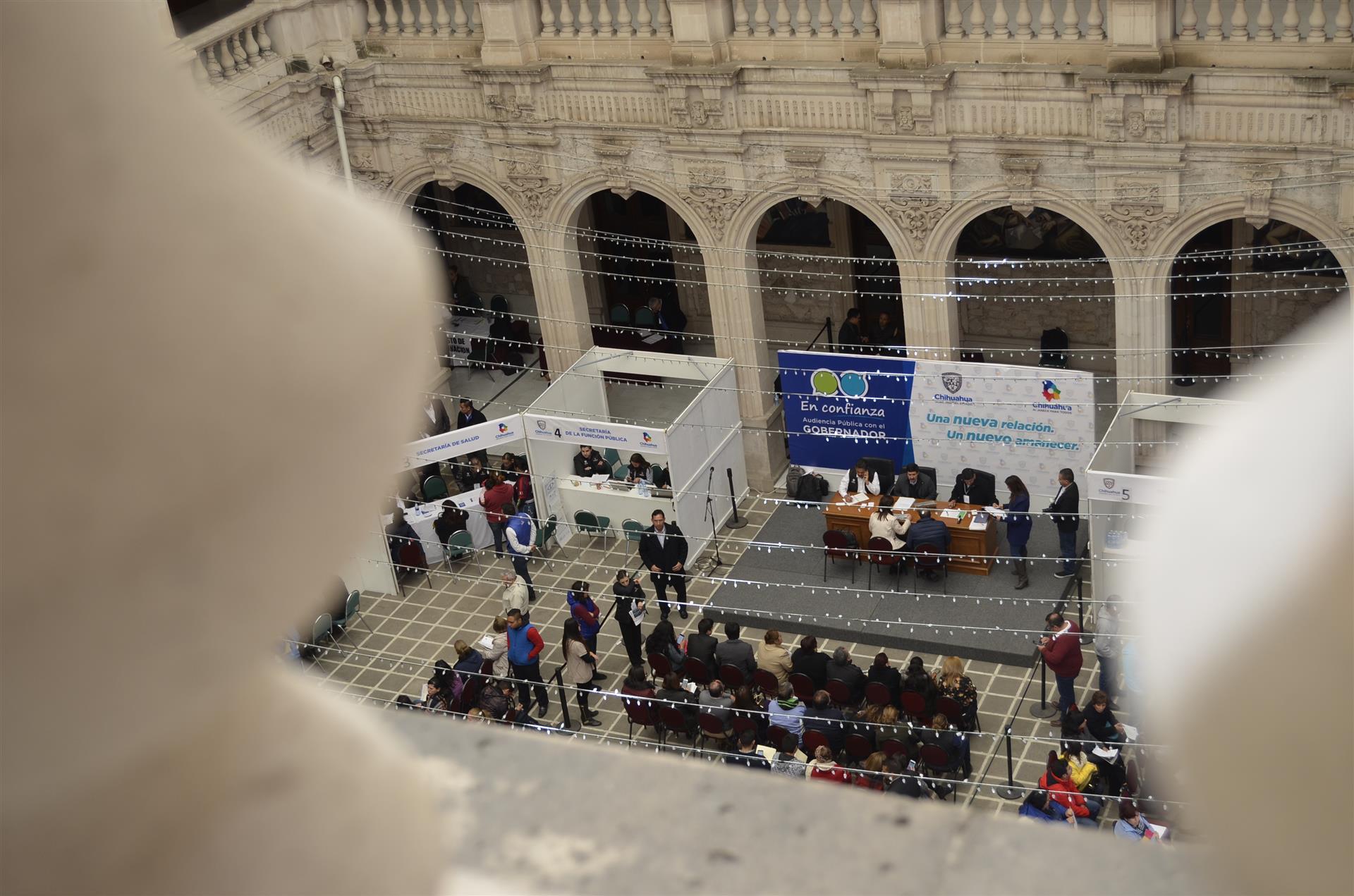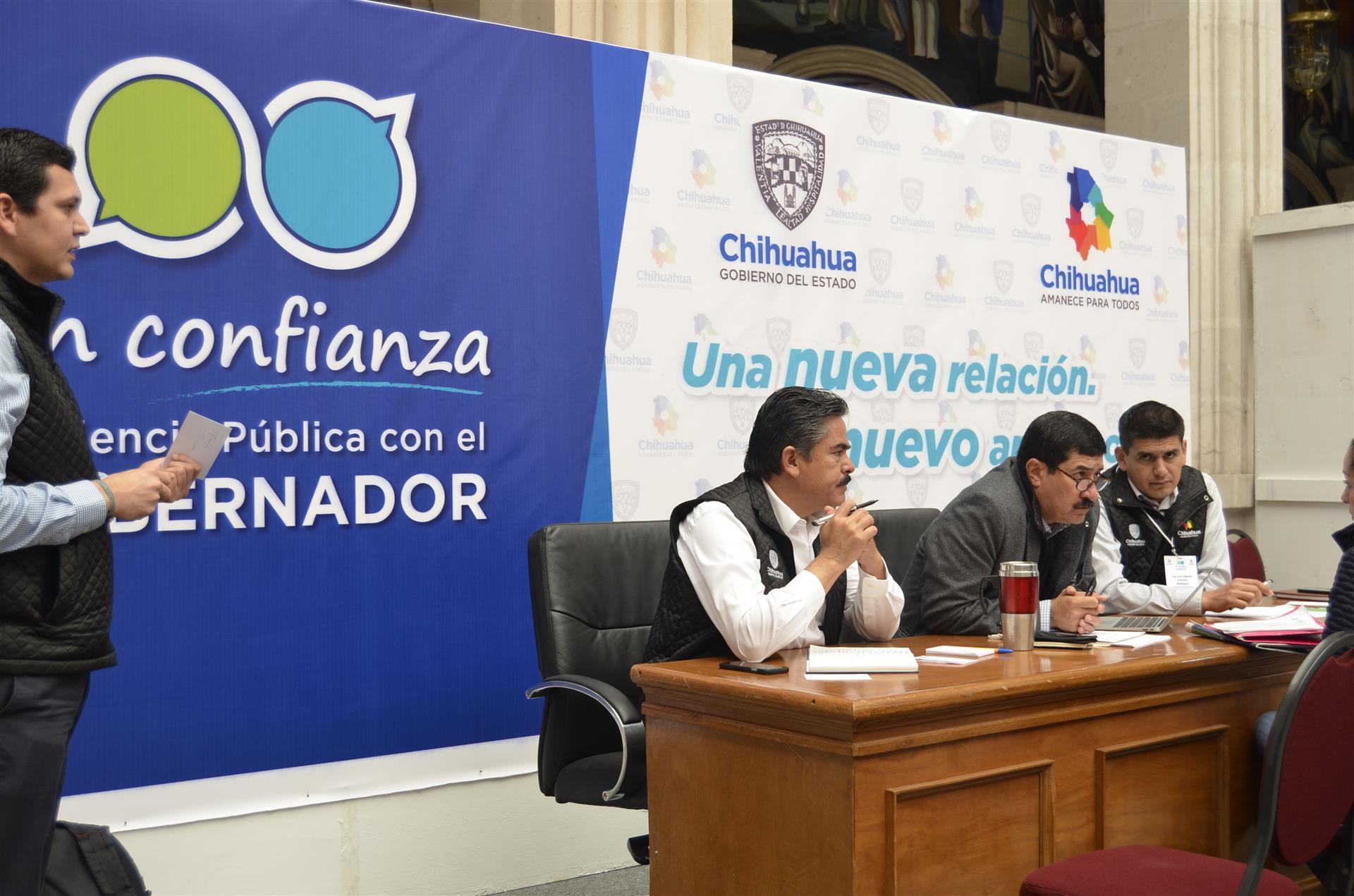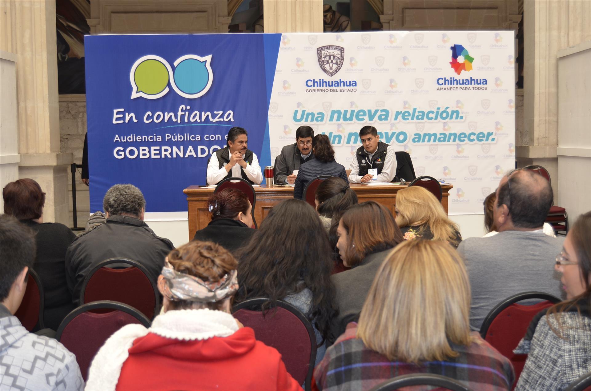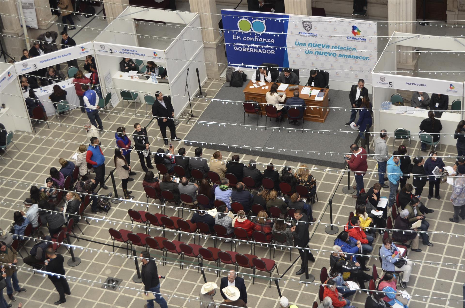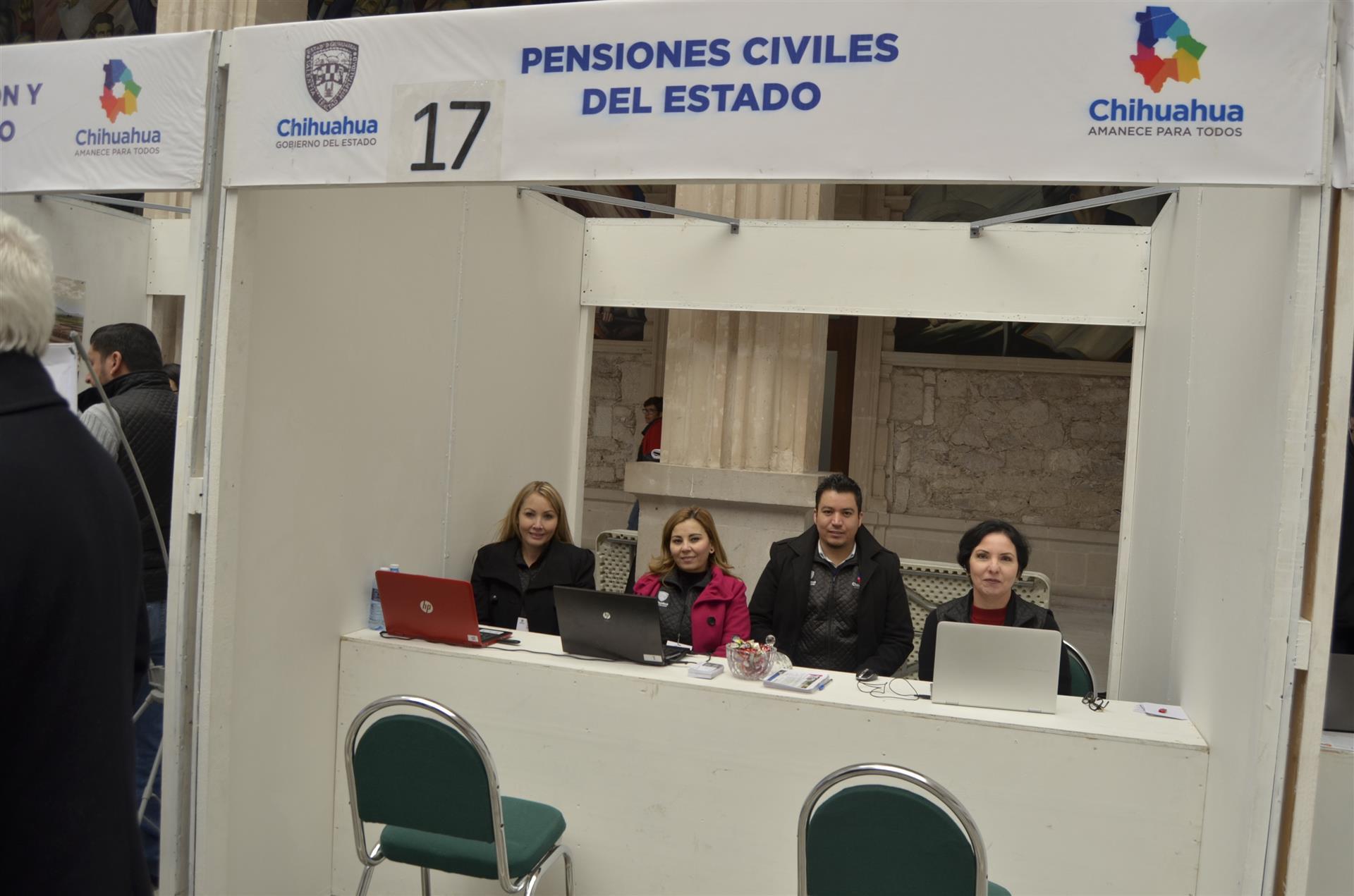 Por segunda ocasión el gobernador Javier Corral atendió esta mañana a toda la ciudadanía que acudió al Palacio de Gobierno para externar sus necesidades e inquietudes, y canalizar todas aquellas que tienen que ver con trámites y servicios que pueden ser atendidas por los funcionarios del las diversas Instituciones o Dependencias del Gobierno del Estado. "En Confianza con el Gobernador" está encaminada a establecer una nueva relación entre el Gobierno y la población de nuestra localidad y del resto del Estado, para conocer de cerca las necesidades más apremiantes de los solicitantes a través de estas "Audiencias Públicas", que cada mes se estarán realizando en esta capital y Cd. Juárez. El equipo de Pensiones Civiles se hizo presente en el stand con la presencia del director de Pensiones C.P. Alberto Herrera.