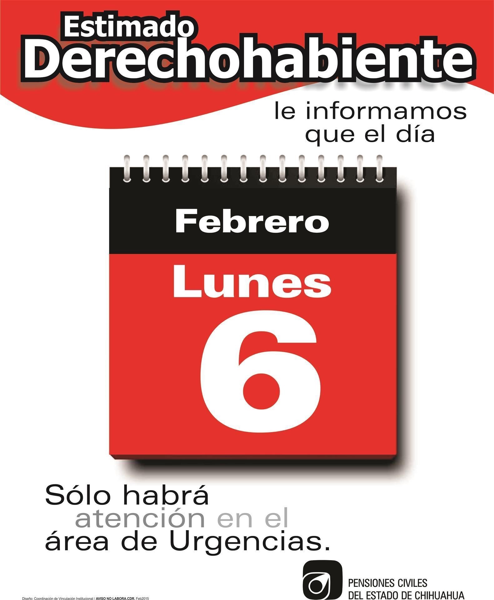 Estimado Derechohabiente le informamos que el día Lunes 6 de Febrero sólo habrá atención en el área de Urgencias