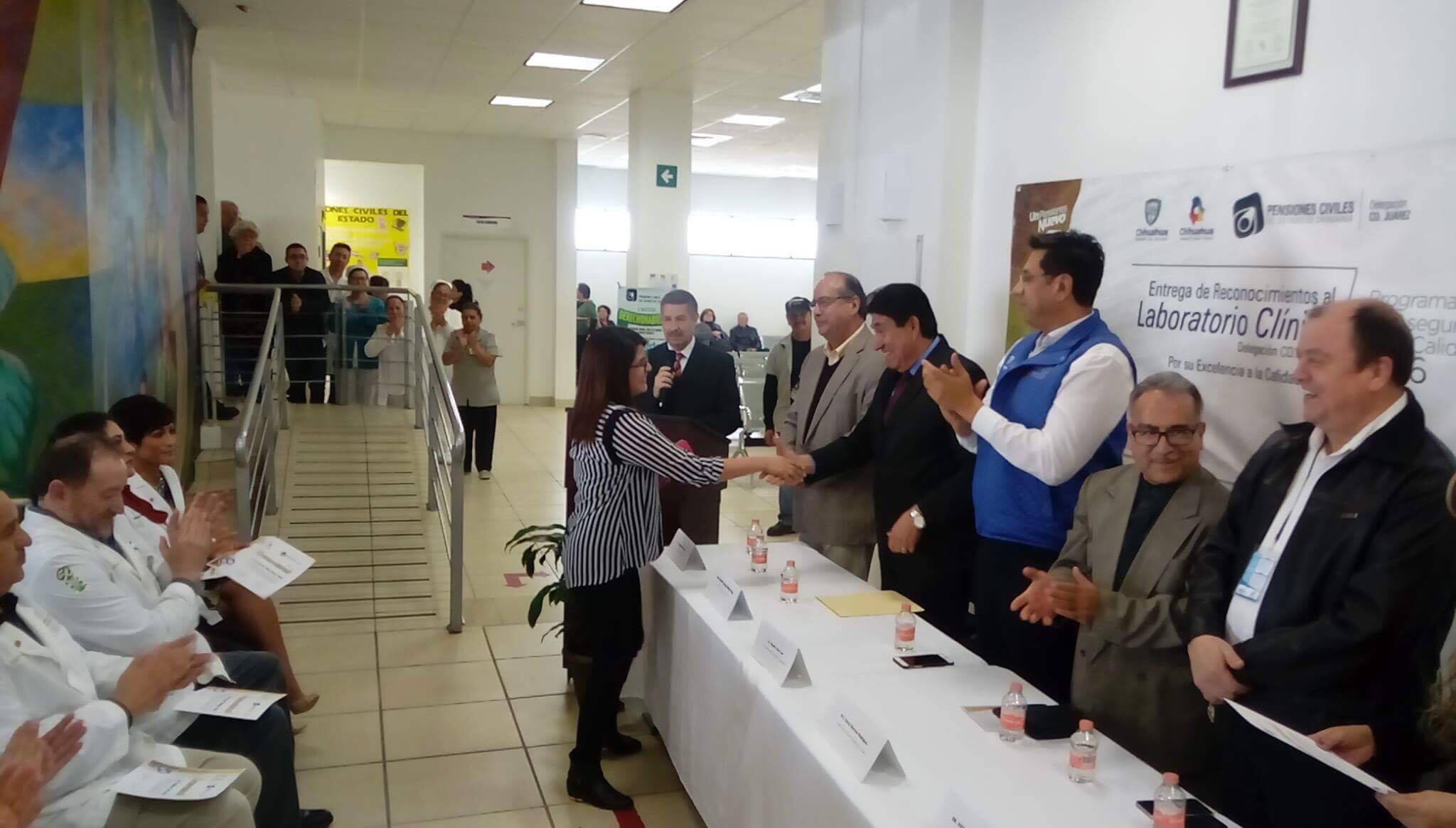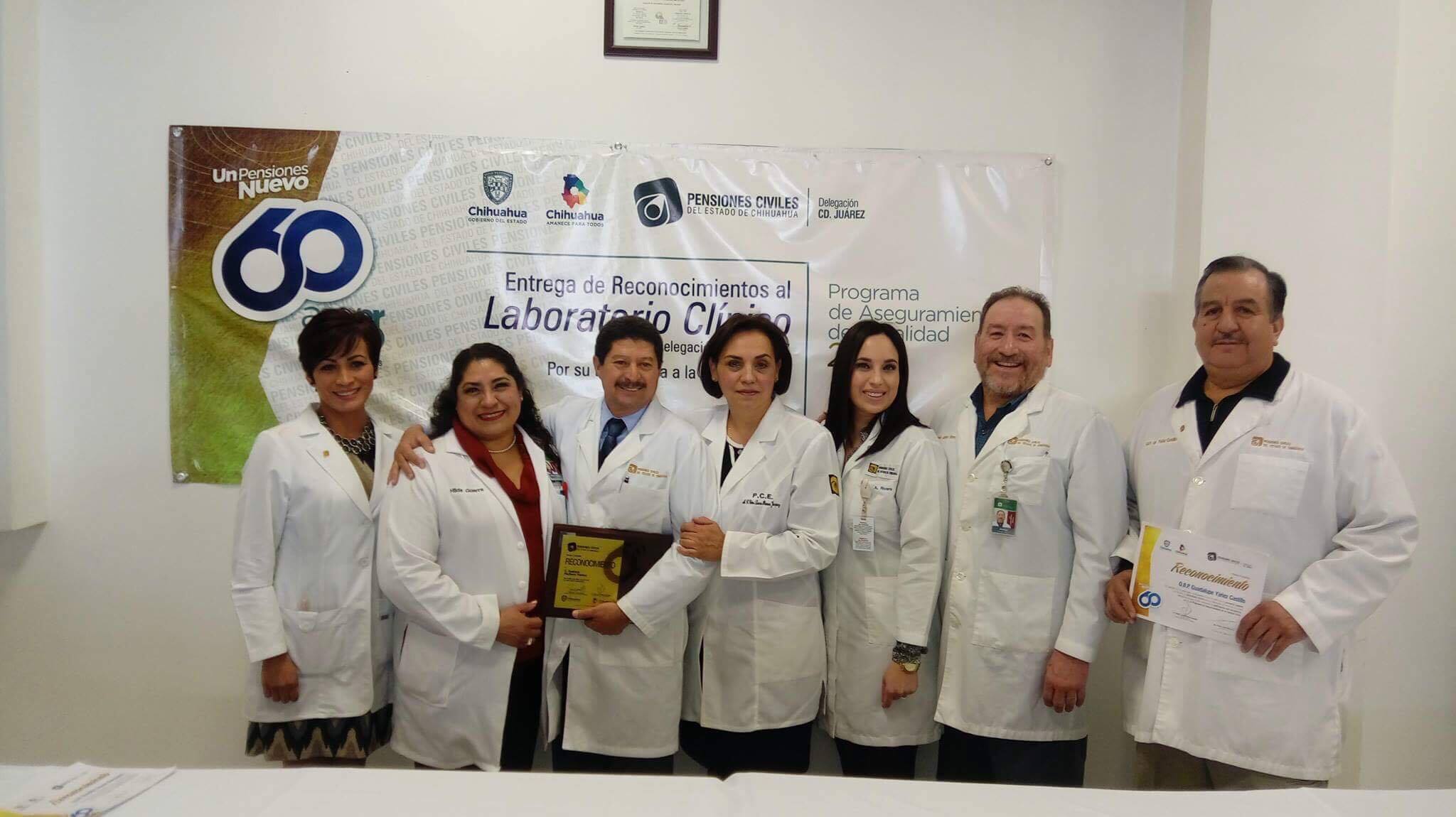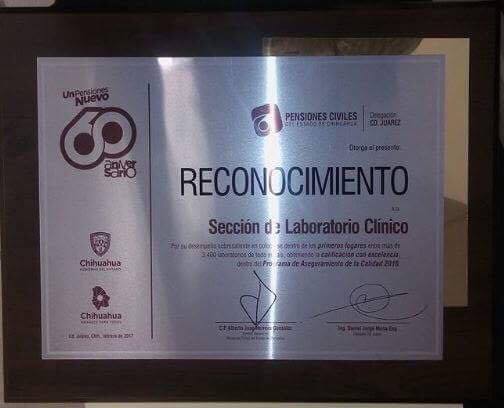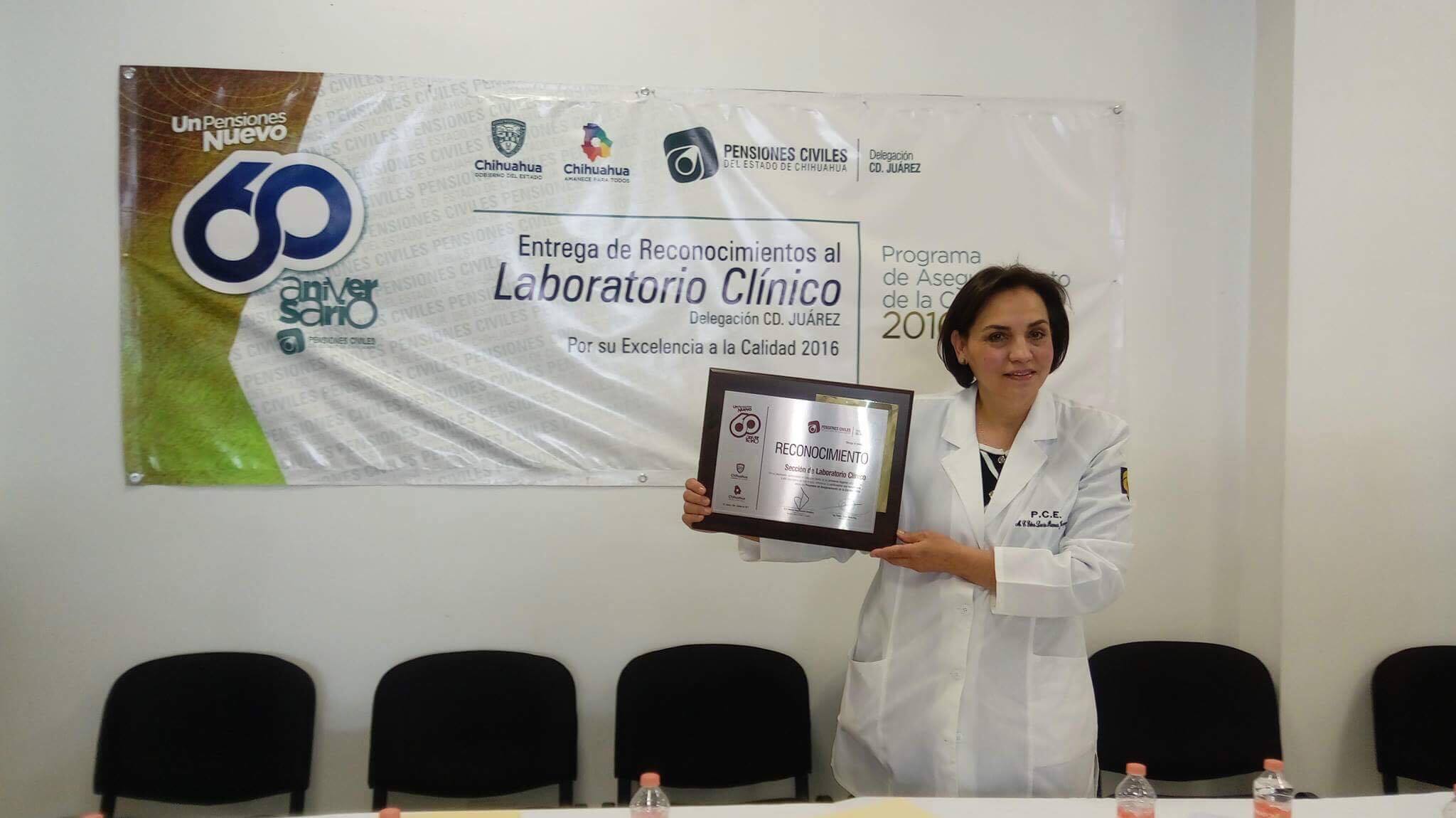En una emotiva ceremonia en la delegación de Pensiones Civiles en Cd. Juárez, el pasado viernes 17 de febrero se entregaron reconocimientos al personal del laboratorio clínico de la Institución, por haber calificado como uno de los primeros lugares a nivel nacional dentro del programa de aseguramiento de la Calidad "PACAL 2016" que se realiza a más de 3,400 laboratorios de todo el país, donde Pensiones Civiles ha obtenido por varios años consecutivos esta calificación de excelencia tanto en Juárez como en Chihuahua, por sus destacados resultados dentro de los parámetros que se evalúan, y así reconocer demás el esfuerzo y compromiso de químicos, auxiliares y demás personal administrativo de esta área de diagnóstico. En la ceremonia encabezada por su delegado Ing. Jorge Mena Enc, se le entregó una placa de reconocimiento a la M.C. Edna Ramos jefa del laboratorio por este logro compartido, y además se entregaron placas de reconocimiento al personal de diversas áreas que ha laborado en la Institución por más de 20, 25 y 30 de servicio.
