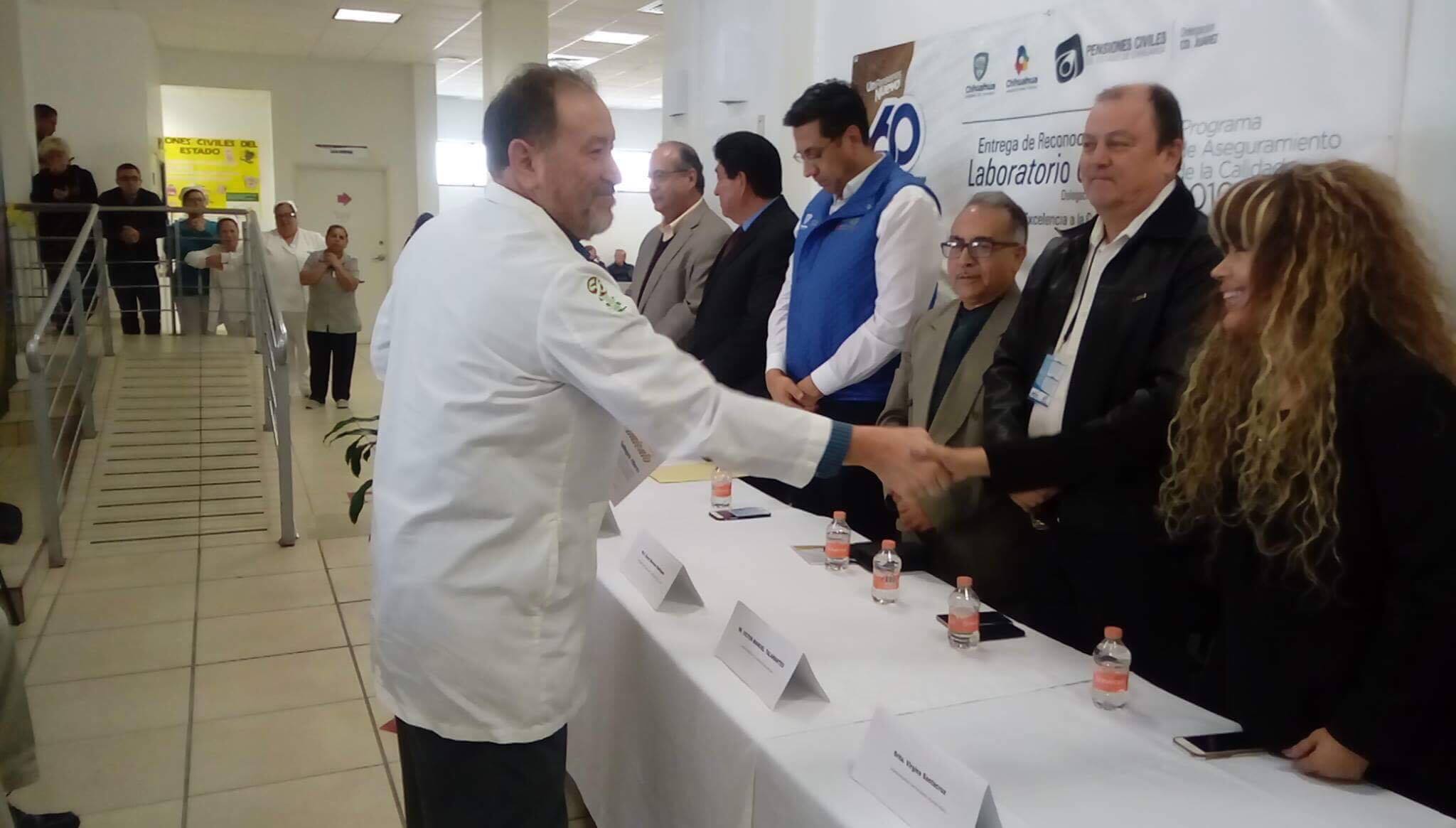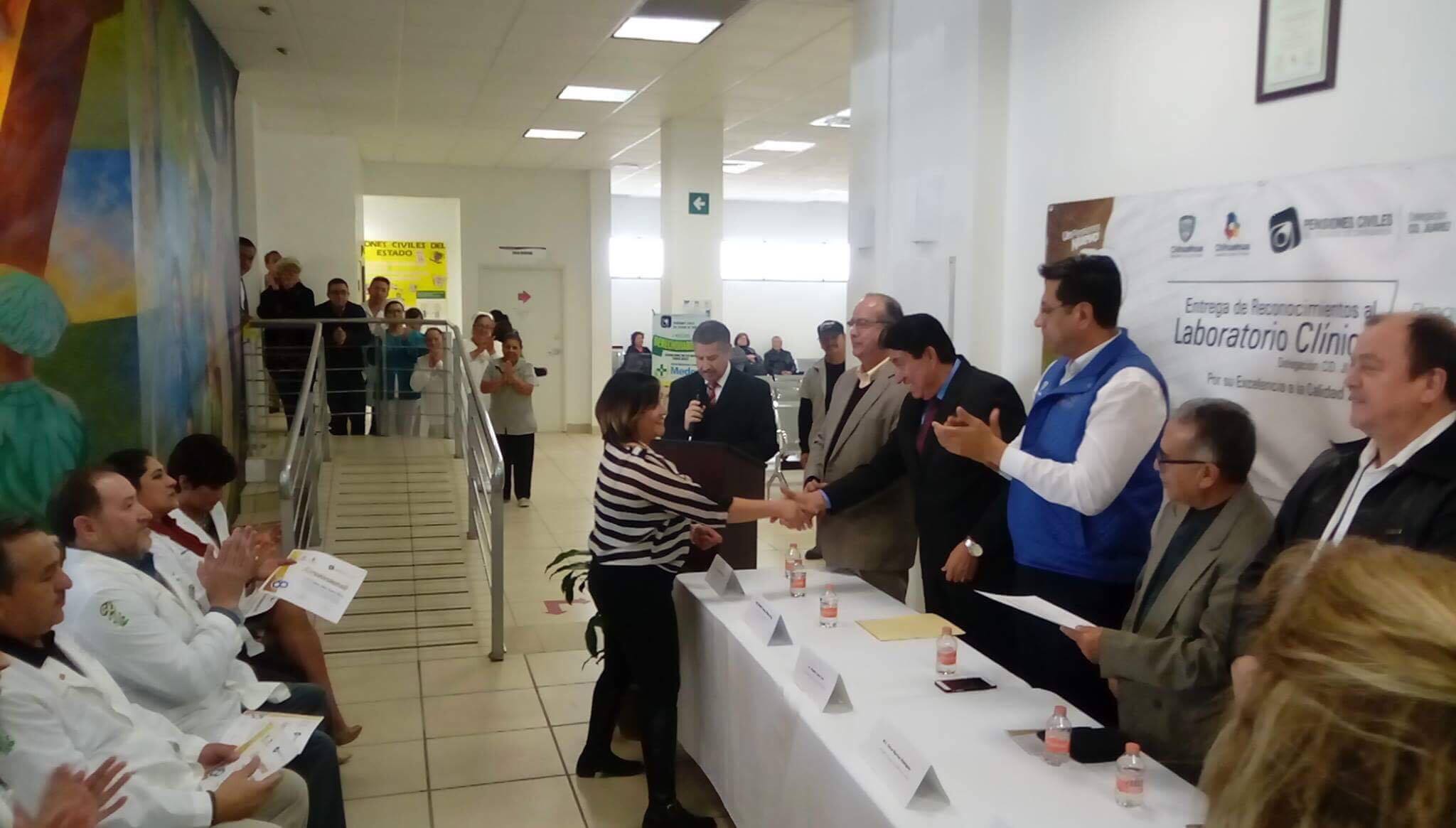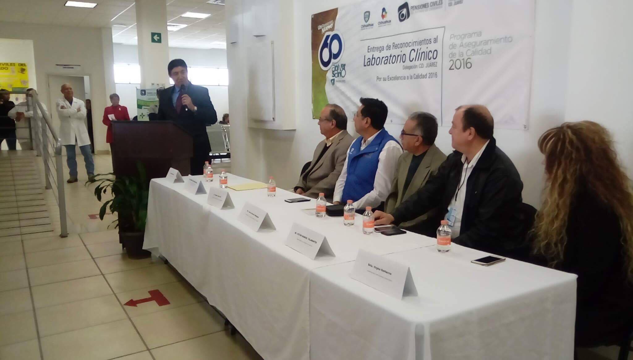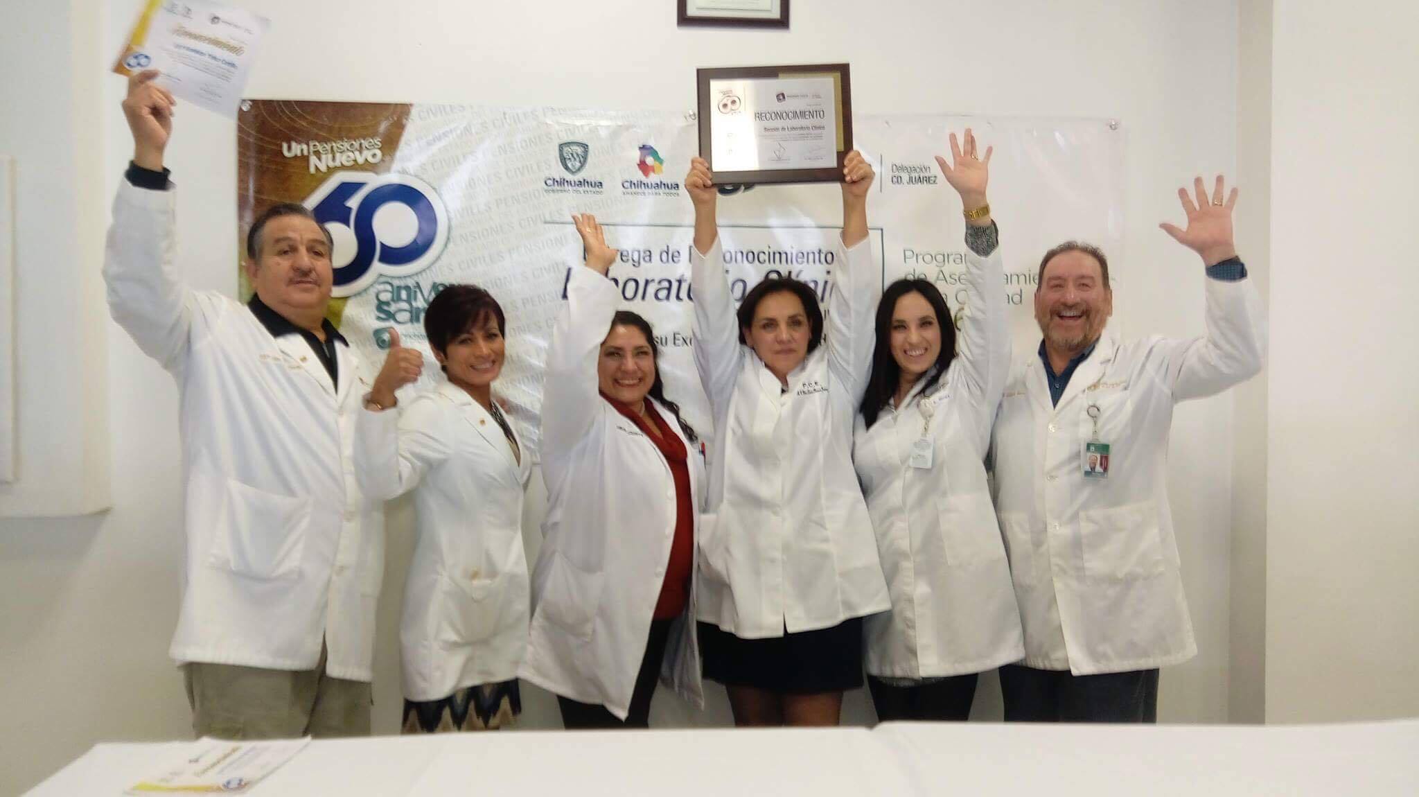En una emotiva ceremonia en la delegación de Pensiones Civiles en Cd. Juárez, el pasado viernes 17 de febrero se entregaron reconocimientos al personal del laboratorio clínico de la Institución, por haber calificado como uno de los primeros lugares a nivel nacional dentro del programa de aseguramiento de la Calidad "PACAL 2016" que se realiza a más de 3,400 laboratorios de todo el país, donde Pensiones Civiles ha obtenido por varios años consecutivos esta calificación de excelencia tanto en Juárez como en Chihuahua, por sus destacados resultados dentro de los parámetros que se evalúan, y así reconocer demás el esfuerzo y compromiso de químicos, auxiliares y demás personal administrativo de esta área de diagnóstico. En la ceremonia encabezada por su delegado Ing. Jorge Mena Enc, se le entregó una placa de reconocimiento a la M.C. Edna Ramos jefa del laboratorio por este logro compartido, y además se entregaron placas de reconocimiento al personal de diversas áreas que ha laborado en la Institución por más de 20, 25 y 30 de servicio.