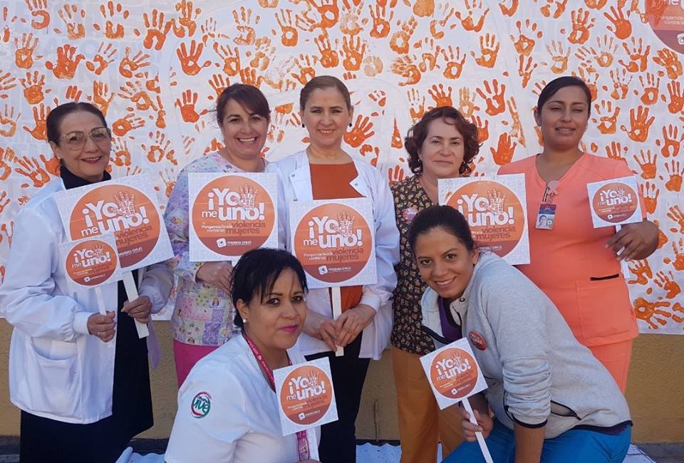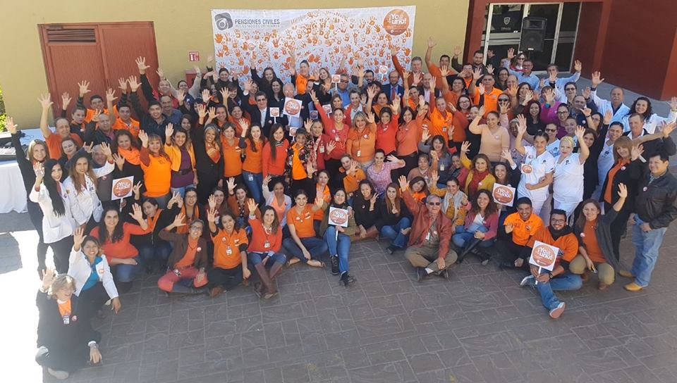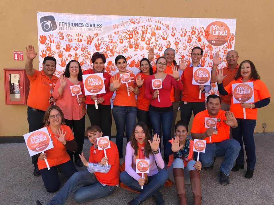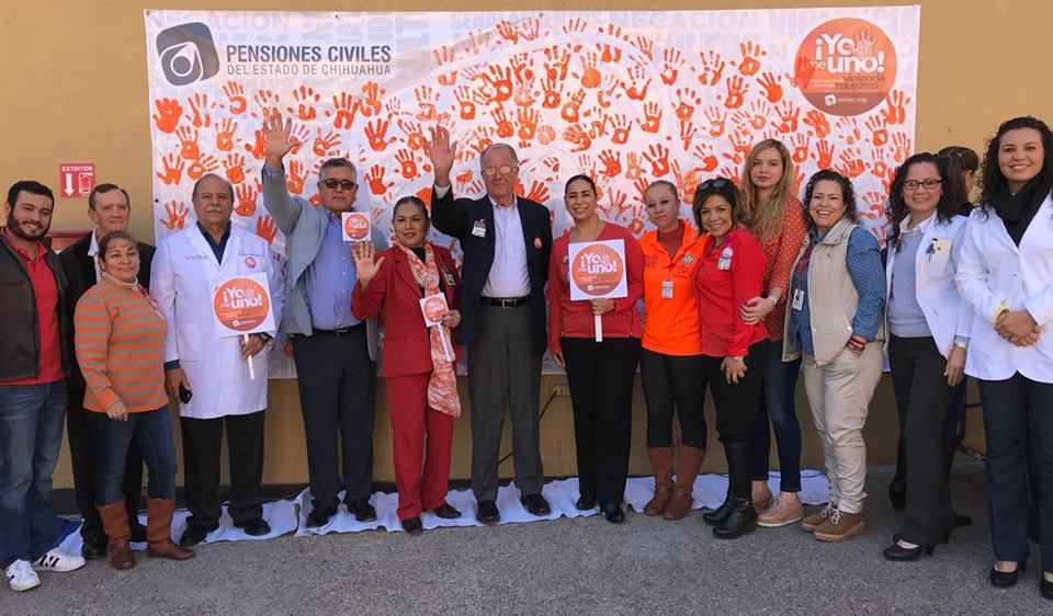 Derechohabientes, directivos, empleadas y empleados de la Pensiones Civiles del Estado (PCE) salieron a la explanada de la Plaza de la Salud para plasmar en un mural su huella y así mismo manifestar su apoyo al Día Naranja con el mensaje “Yo Me Uno”.