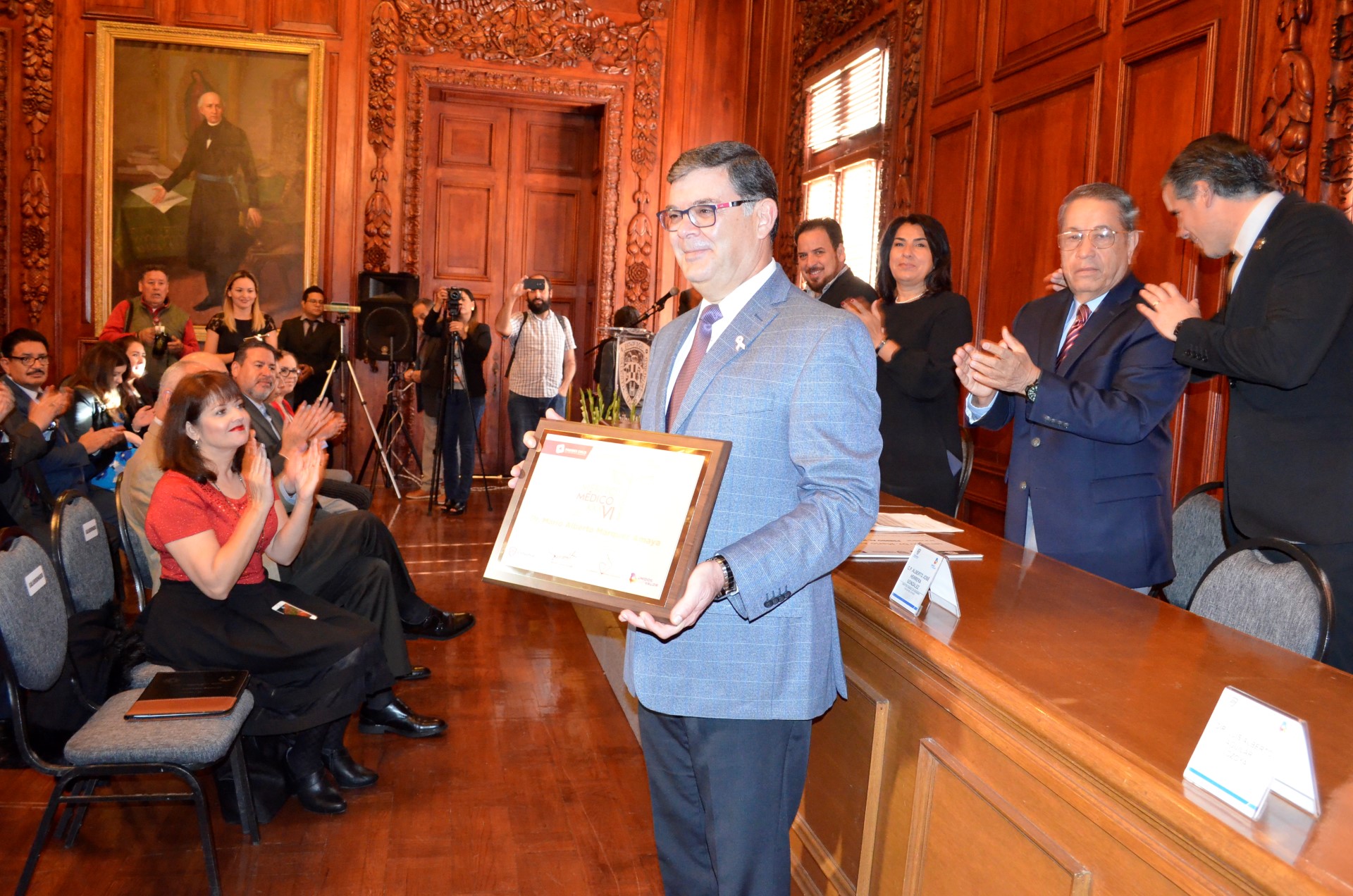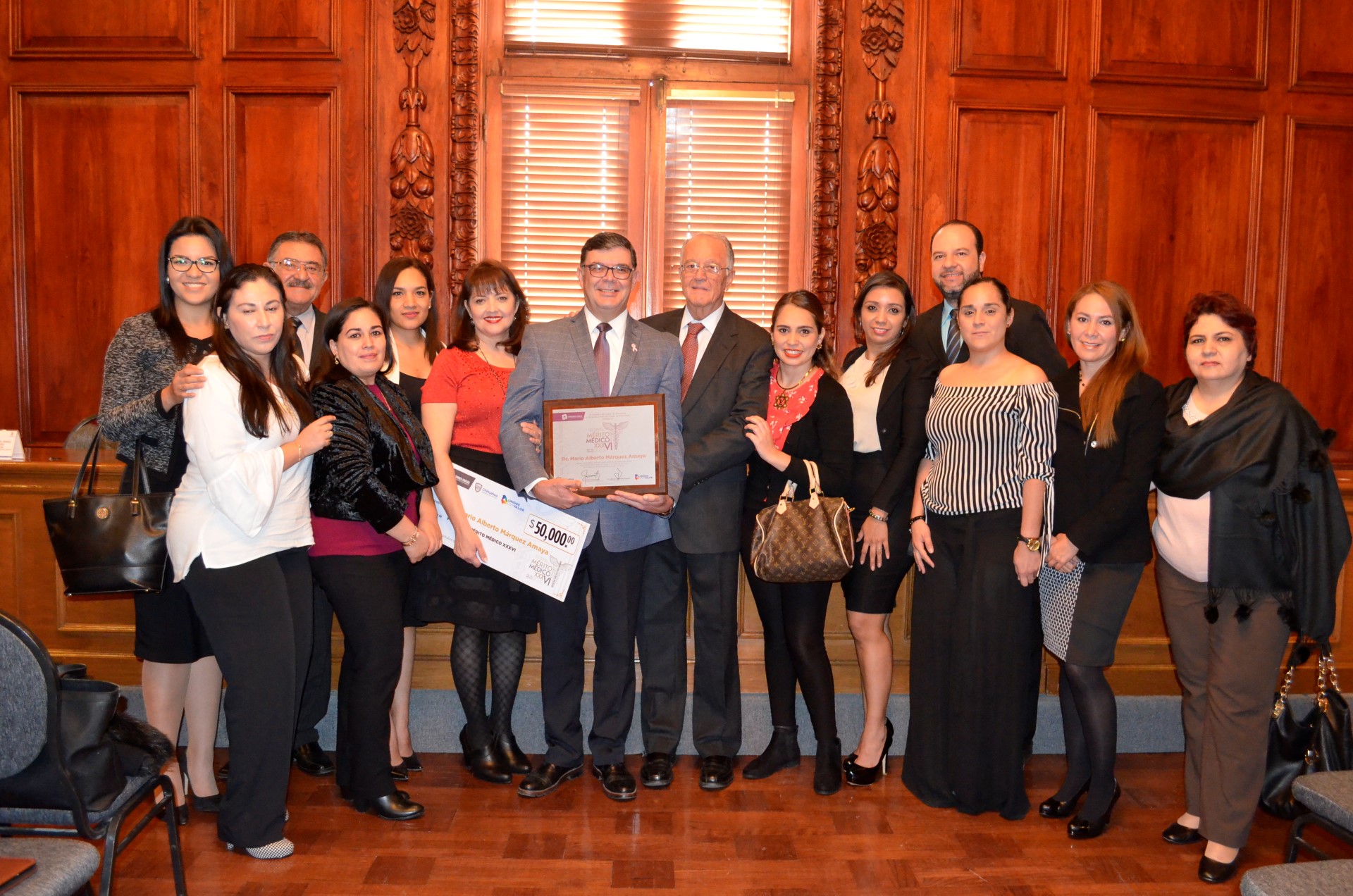 En el marco del Día del Médico, el neurólogo Mario Alberto Márquez Amaya, recibió en el Salón Rojo de Palacio de Gobierno, el Premio Pensiones al Mérito Médico 2018, por sus actividades de investigación realizados en beneficio de la población chihuahuense. El galardonado comentó: “Reconocer el mérito de un médico es reconocer a todos los que ejercen la medicina, sin excepción alguna. Hoy formo parte de Pensiones y estoy comprometido al 110 por ciento con mis pacientes y mis compañeros de trabajo. 28 años de recorrido, me han traído aquí y ahora para vivir una de las experiencias más enriquecedoras a las que puede aspirar un profesionista”. ¿SABÍAS QUÉ? El Dr. Márquez ha realizado trabajos de investigación durante 24 años en el tratamiento y diagnóstico integral para la epilepsia, encefalitis y esclerosis múltiples.