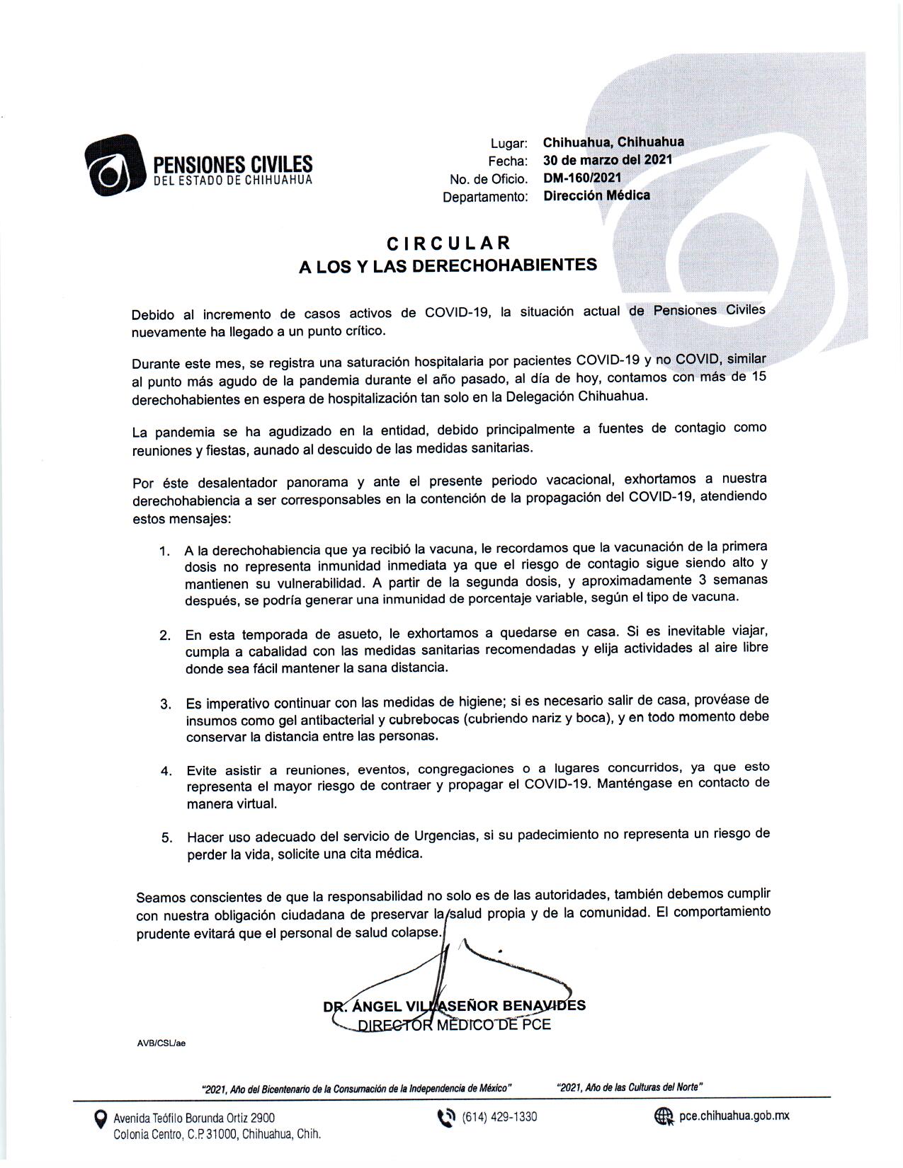 Debido al incremento de casos activos de COVID-19 en la derechohabiencia de Pensiones Civiles del Estado (PCE), la Dirección Médica emitió una circular exhortando a las y los afiliados, a ser corresponsables en la contención de la propagación del virus SARS-CoV-2.