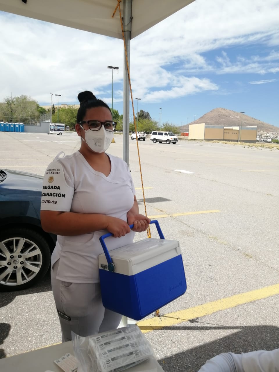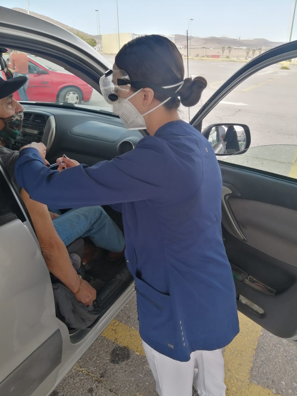 -Un grupo de 12 enfermeras de Pensiones Civiles apoya la jornada de inmunización a personas adultas mayores residentes de la ciudad, en el puesto habilitado en el Campus II de la UACH