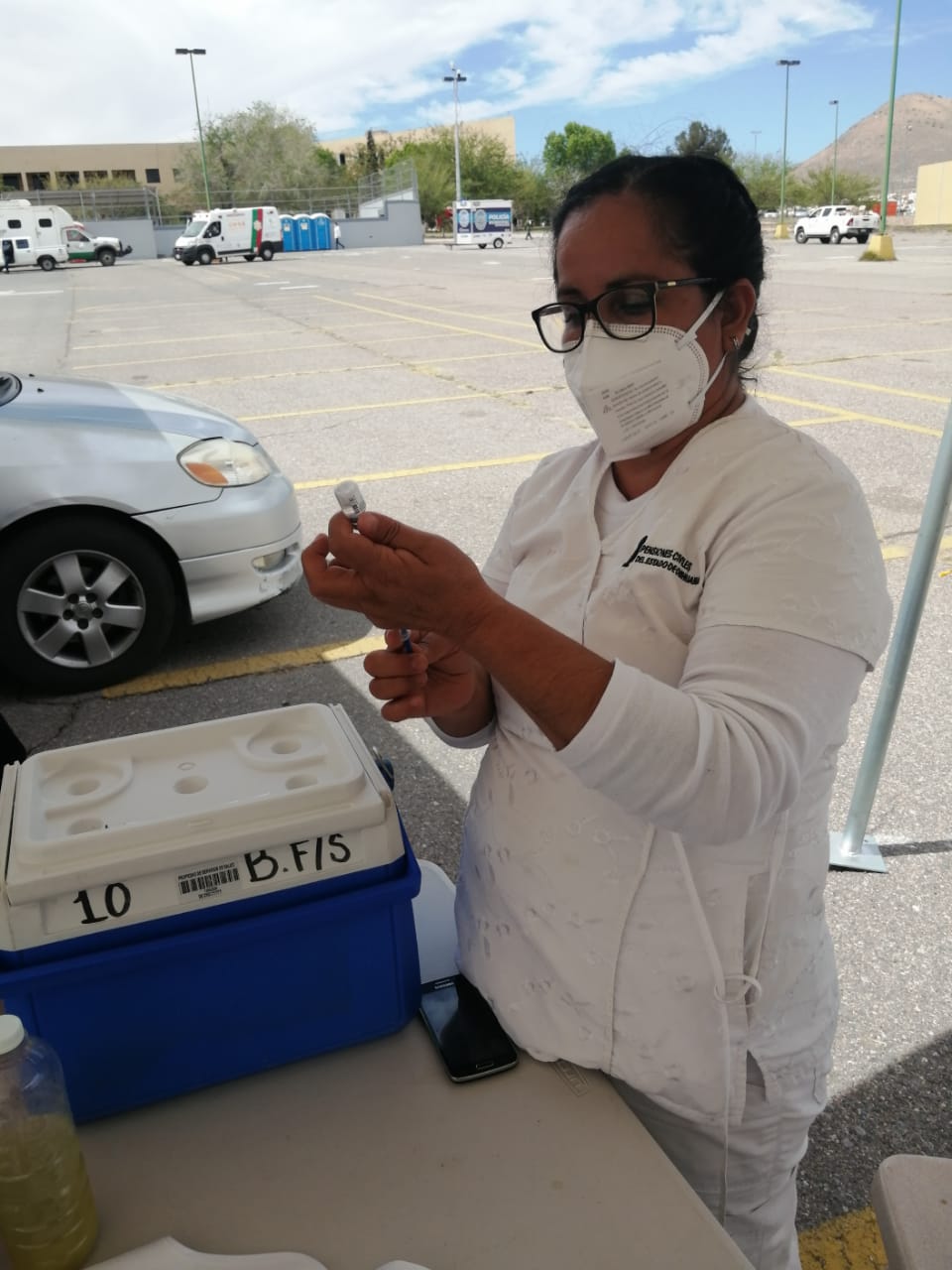 Personal de Enfermería de Pensiones Civiles del Estado (PCE) colabora en la jornada de vacunación contra el virus SARS-CoV2 en la ciudad de Chihuahua, en el puesto habilitado en el Campus II de la Universidad Autónoma de Chihuahua (UACH).