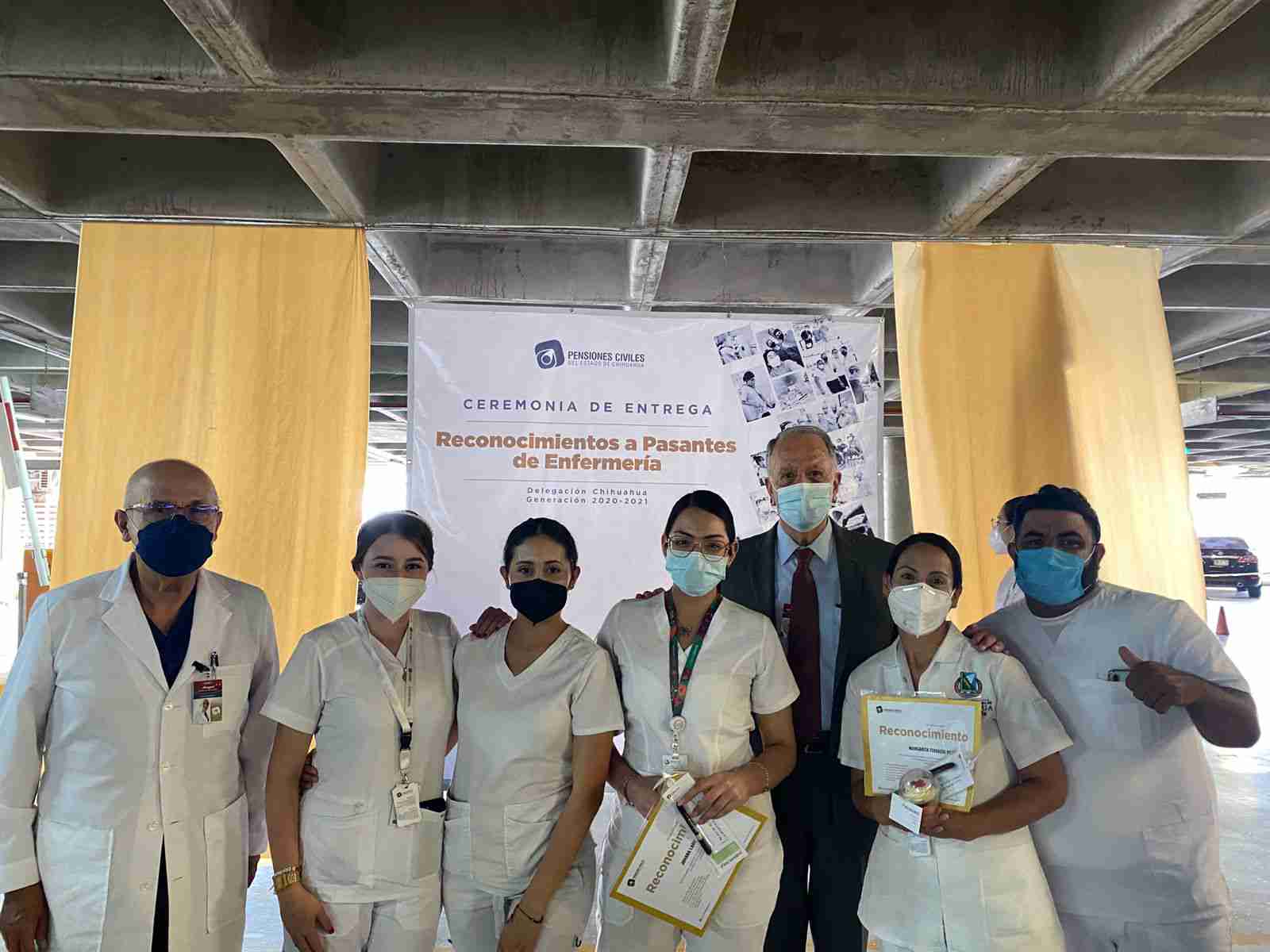 Pensiones Civiles del Estado (PCE) entregó un reconocimiento a las y los 35 pasantes de Enfermería que realizaron su servicio social en las unidades de la Delegación Chihuahua, en el periodo de agosto del 2020 a julio del 2021.