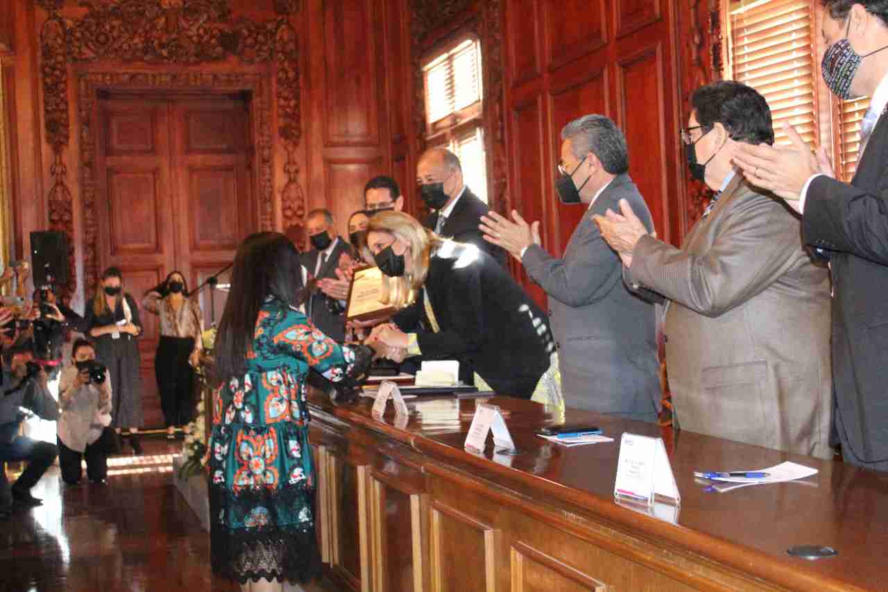 En el marco del Día del Médico, la gobernadora Maru Campos Galván entregó a la pediatra Ana Elena Navarrete Ordóñez el Premio Pensiones al Mérito Médico, en su edición XXXIX por 20 años de servicio, actividad docente y de investigación en el Salón Rojo de Palacio de Gobierno.