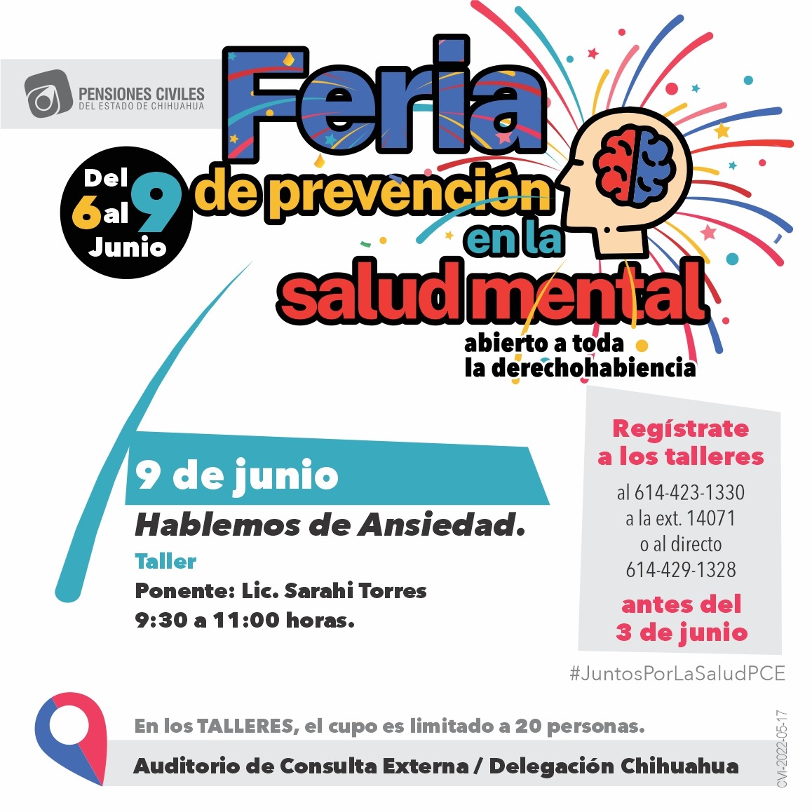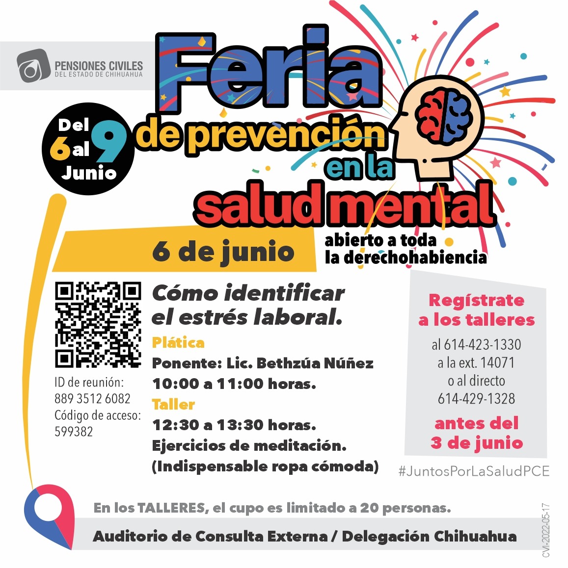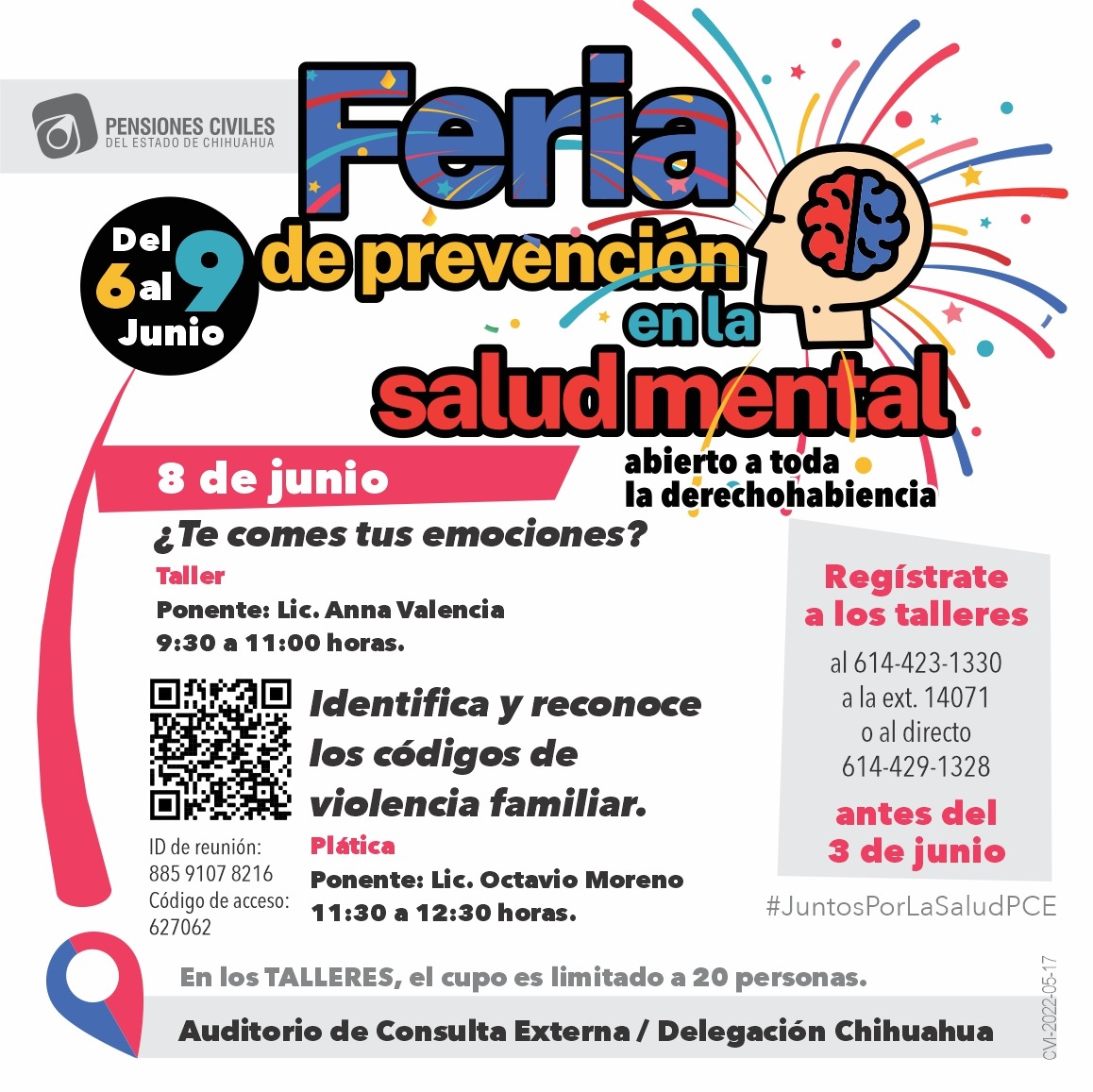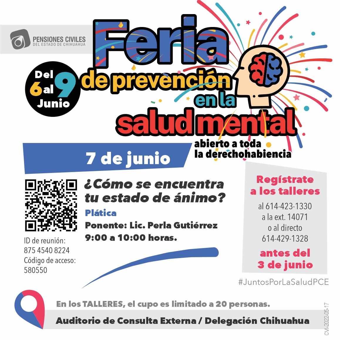 La Dirección Médica de Pensiones Civiles del Estado (PCE) llevará a cabo del 6 al 9 de junio, la Feria de Prevención en la Salud Mental, con pláticas vía Zoom y talleres presenciales, dirigidos a derechohabientes e impartidos por personal del área de Psicología de la institución.