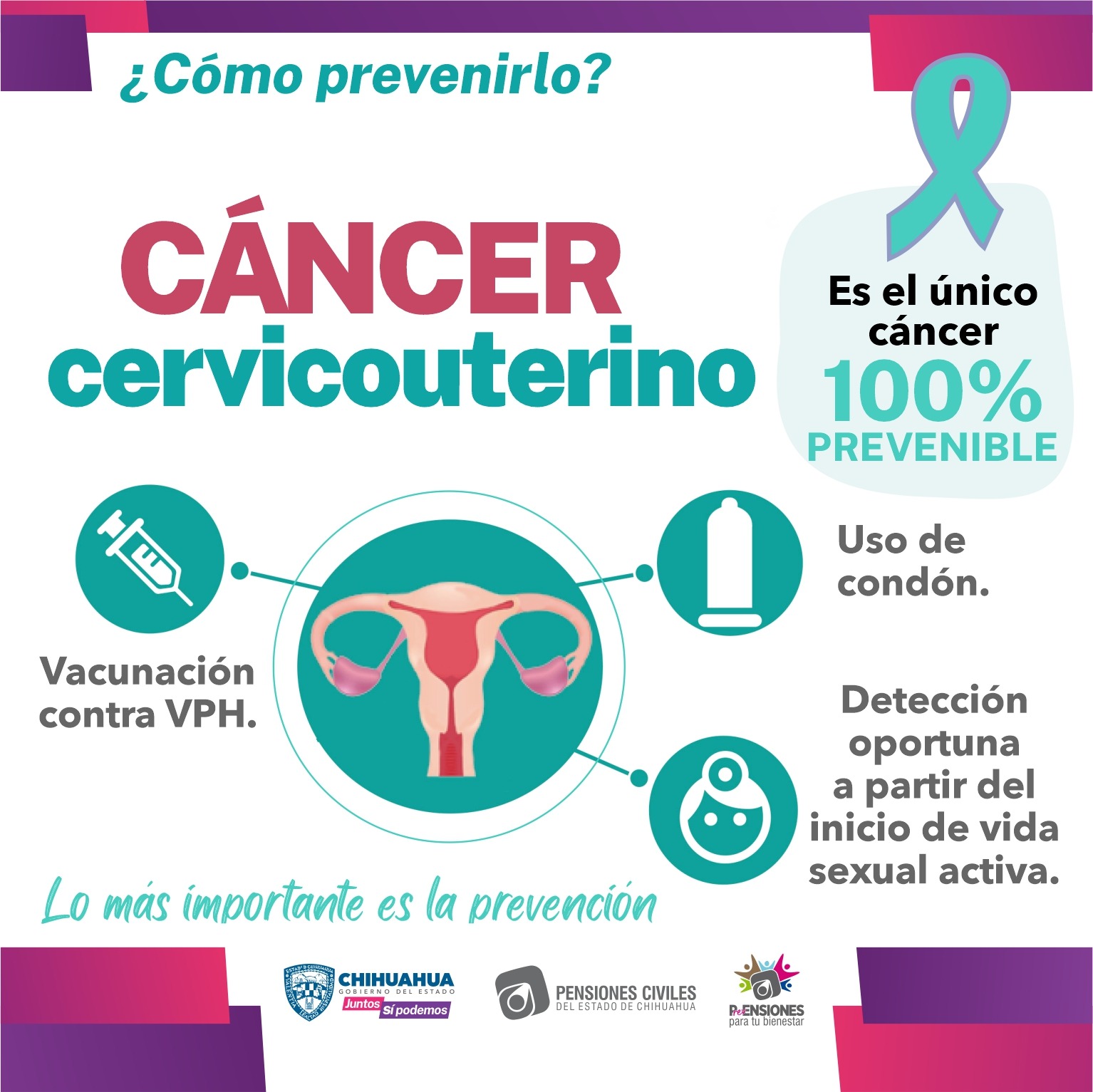 El responsable del área de Salud Pública de PCE, Heriberto Miranda Pérez, explicó que este tipo de cáncer es prevenible si se realizan recomendaciones como, aplicar la vacuna contra el VPH a niñas de 5º año de primaria o de 11 años no escolarizadas, la cual protege contra los tipos de VPH asociados al 70 por ciento de los cánceres; uso de condón, con lo que se reduce en 70 por ciento la transmisión del Virus del Papiloma Humano (VPH), así como la detección y tratamiento de lesiones precancerosas.