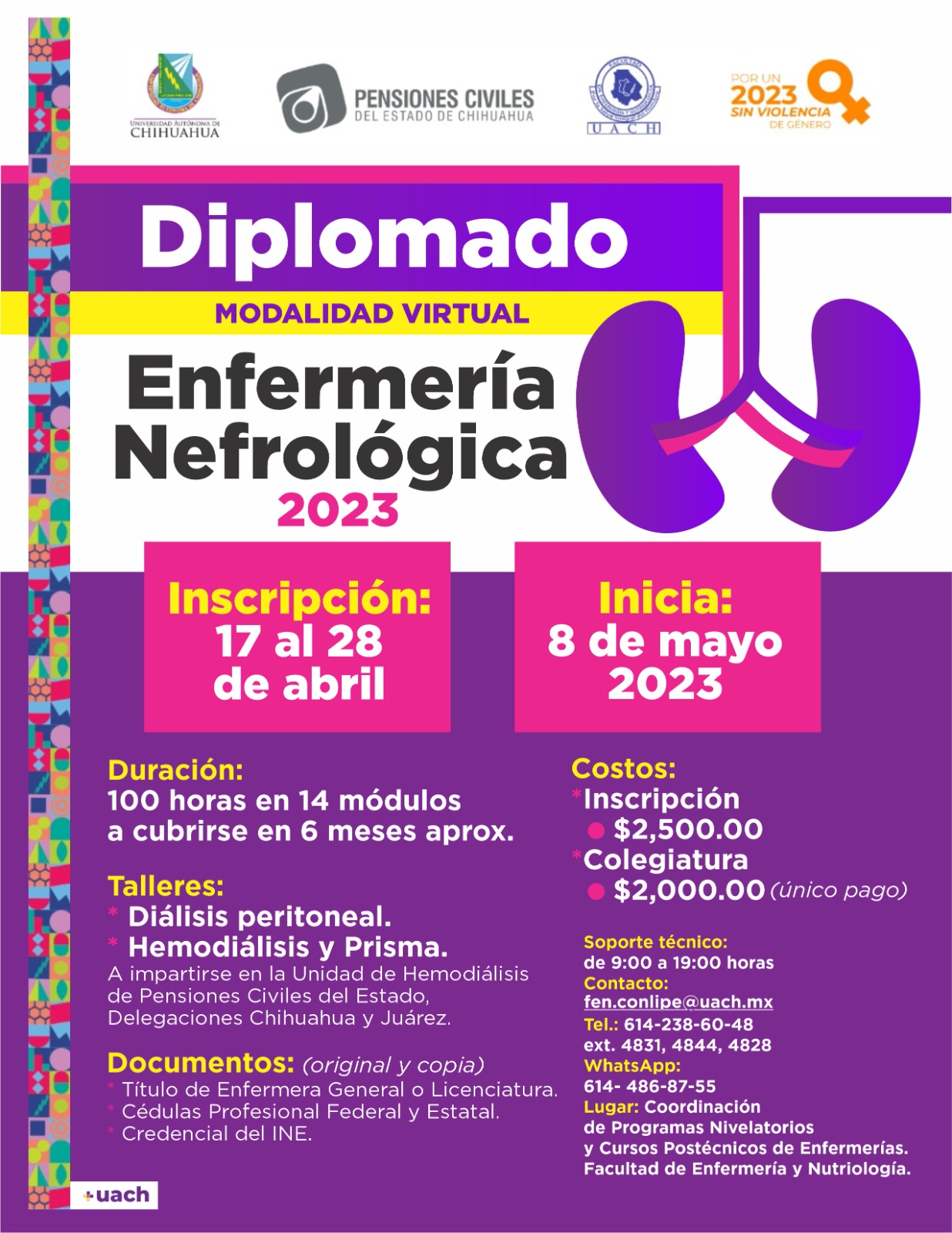 Pensiones Civiles del Estado (PCE), en coordinación con la Facultad de Enfermería de la Universidad Autónoma de Chihuahua (UACH), invitan al personal de enfermería titulado perteneciente a instituciones públicas o privadas, al Diplomado en Enfermería Nefrológica.