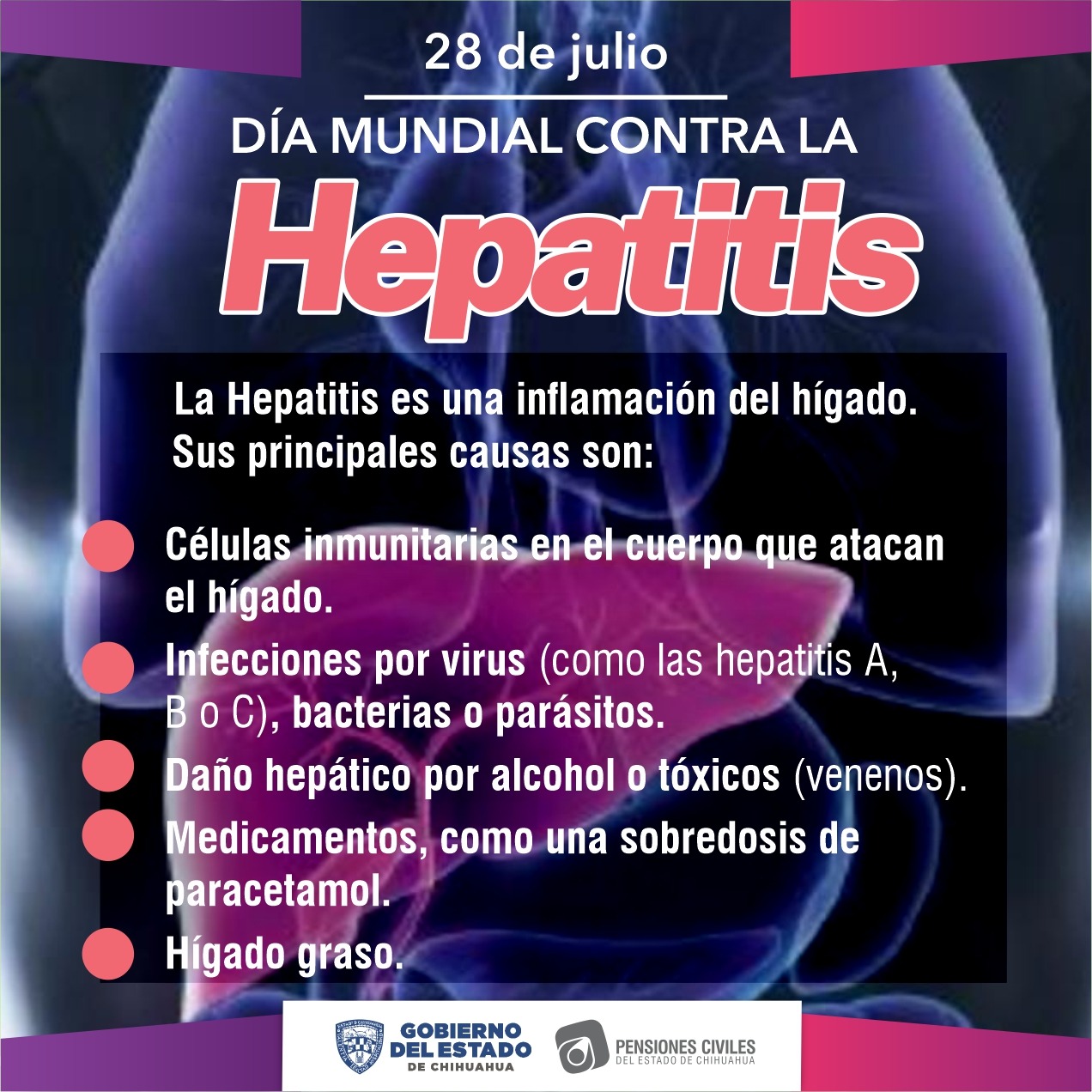 En el marco del Día Mundial contra la Hepatitis, que se conmemora cada 28 de julio, Pensiones Civiles del Estado (PCE) a través de su Dirección Médica, exhorta a la población a concientizarse y adoptar las medidas preventivas para evitar contraer esta enfermedad.