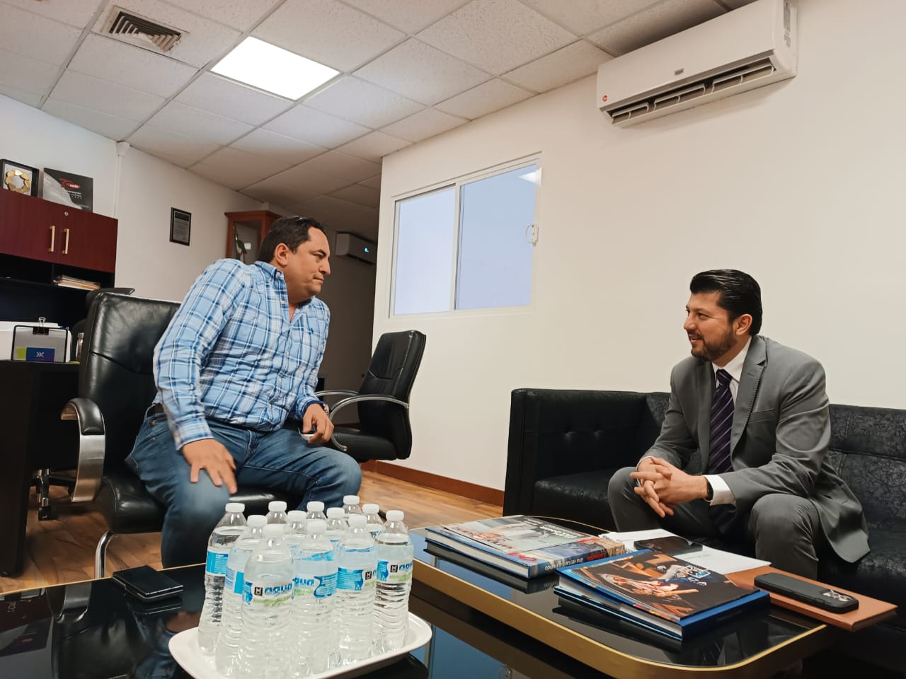 El director de Pensiones Civiles del Estado (PCE), Heriberto Miranda Pérez, y el director de la Junta Municipal de Agua y Saneamiento (JMAS), Alan Falomir Sáenz, se reunieron para analizar alternativas de solución al adeudo interinstitucional heredado por pasadas administraciones.