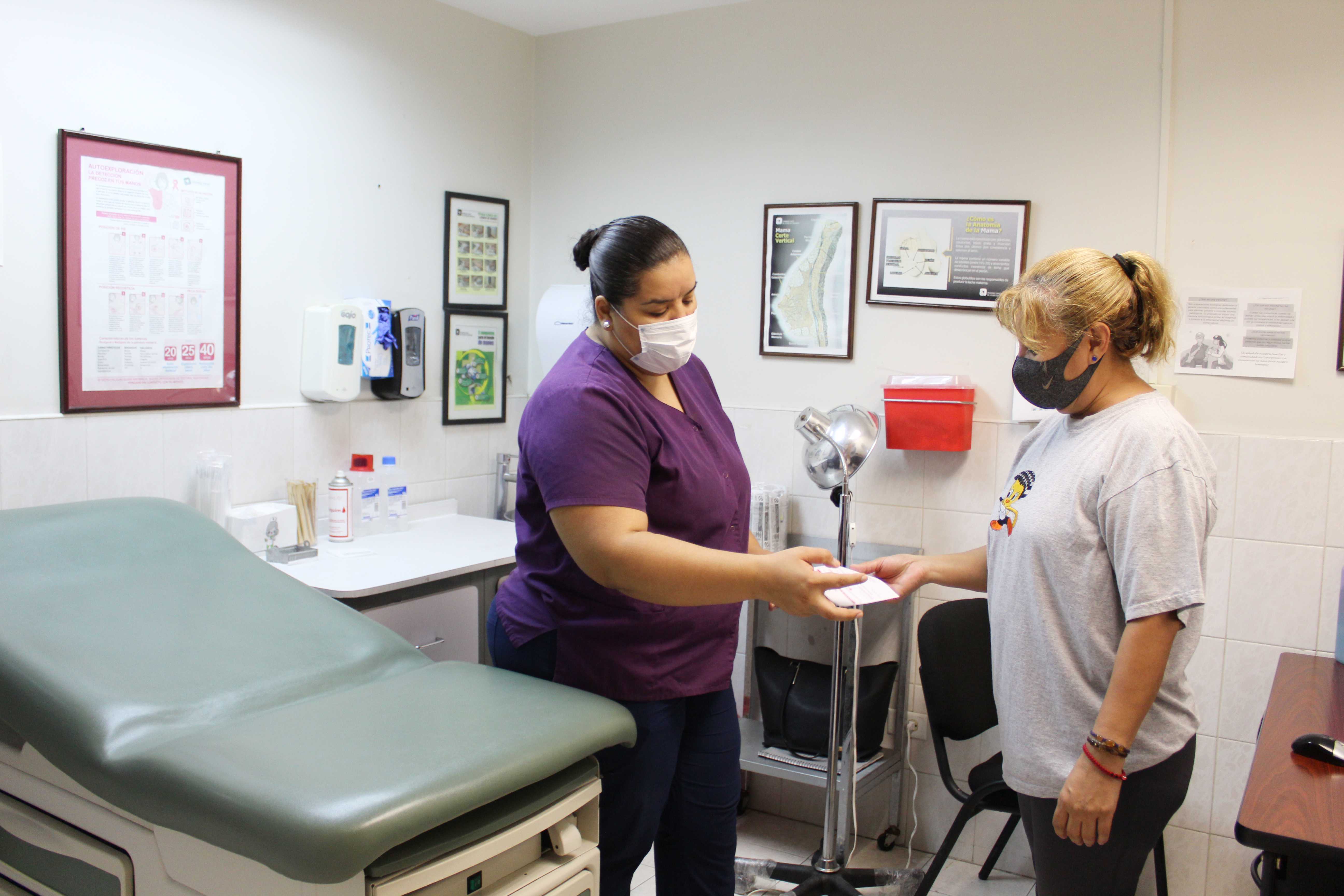 Se toma una muestra de la derechohabiente para la realización de la prueba del cáncer cervicouterino y cáncer del seno para la detección oportuna.