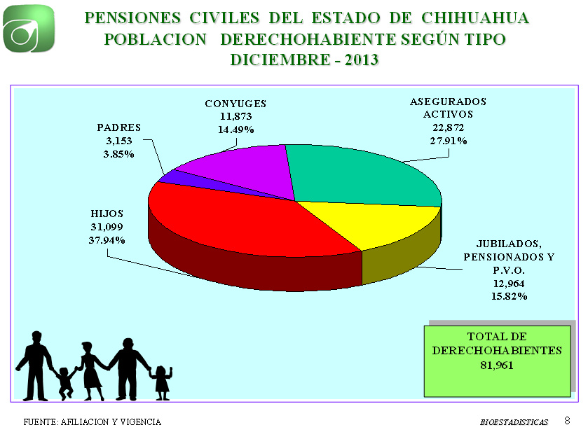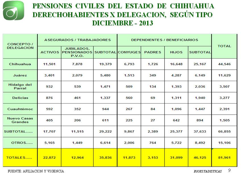 Más del 56 % de los asegurados de Pensiones Civiles del Estado son profesionistas del Magisterio, el 22% trabajadores del Gobierno del Estado, el 9% de la UACH y el 4% son trabajadores de Pensiones Civiles. Esto significa que el 91% de los trabajadores afiliados corresponde a personas con un buen nivel de educación y cultura, que se espera que sea corresponsable del autocuidado de su salud, aunque también, es una población que está informada de los avances en salud y por lo tanto es más demandante de servicios de calidad, de tecnología de punta en los recursos para la salud y esto genera mayor costo a la Institución, para satisfacer esta demanda.